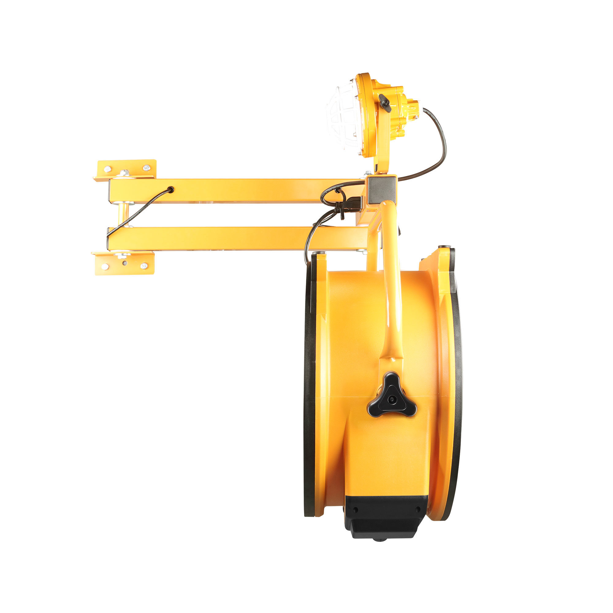 De meegeleverde 40 inch dubbele wandmontagearm met veerconstructie maakt het mogelijk om zowel de ventilator als de LED-lamp flexibel te positioneren. U kunt de richting van de luchtstroom en de lichtbundel eenvoudig aanpassen, zodat de ventilatie en verlichting precies daar terechtkomen waar ze nodig zijn. Dit maakt het systeem ideaal voor vaste montage bij laadperrons of werkstations.