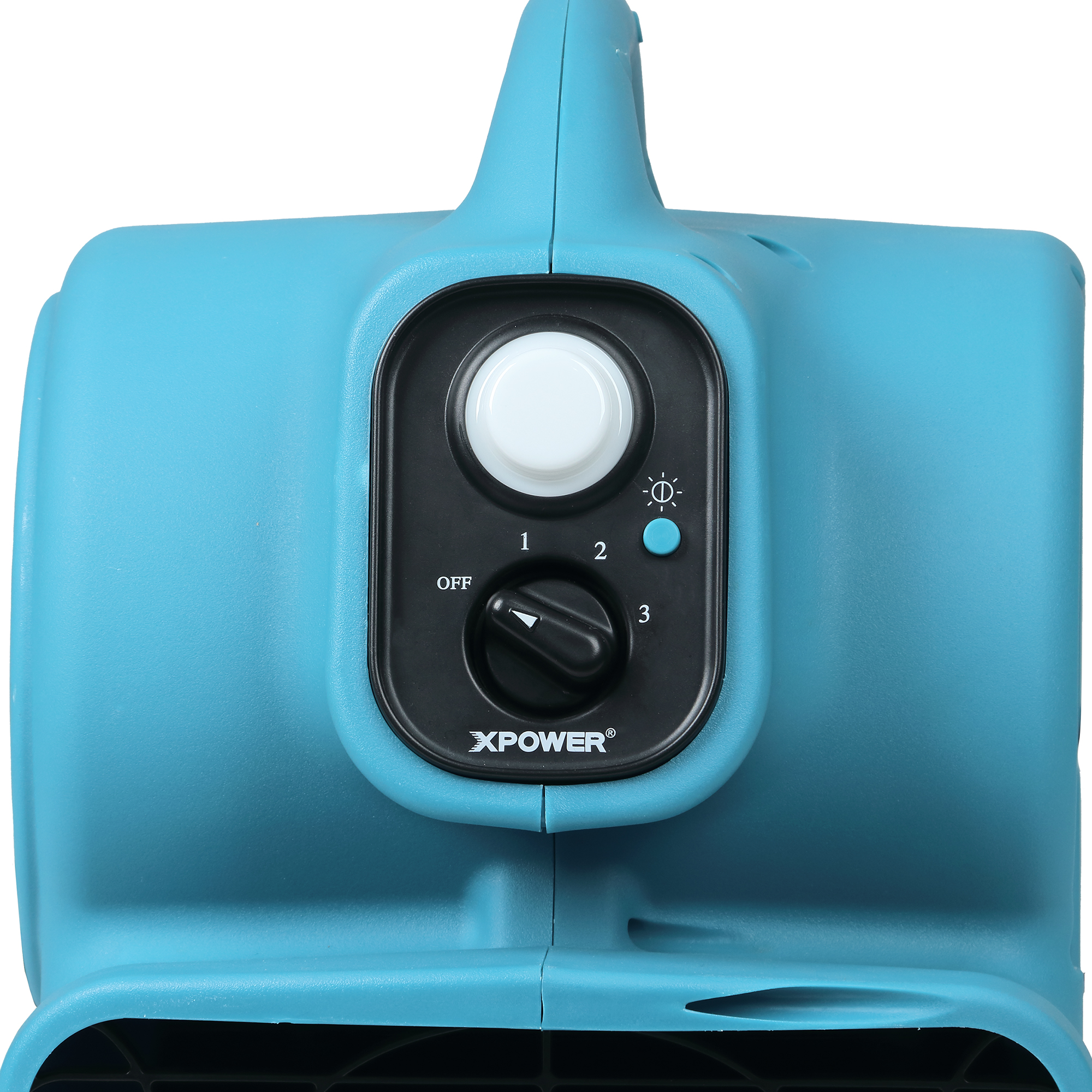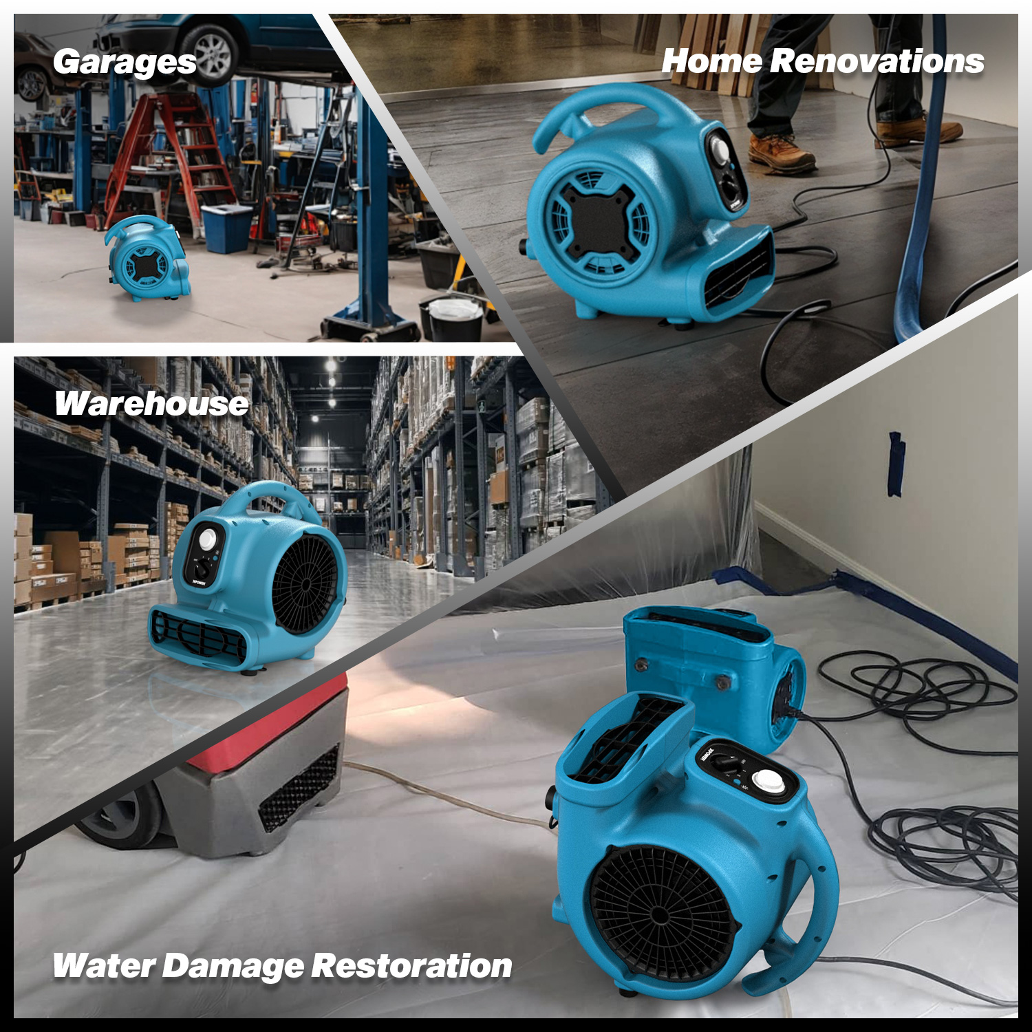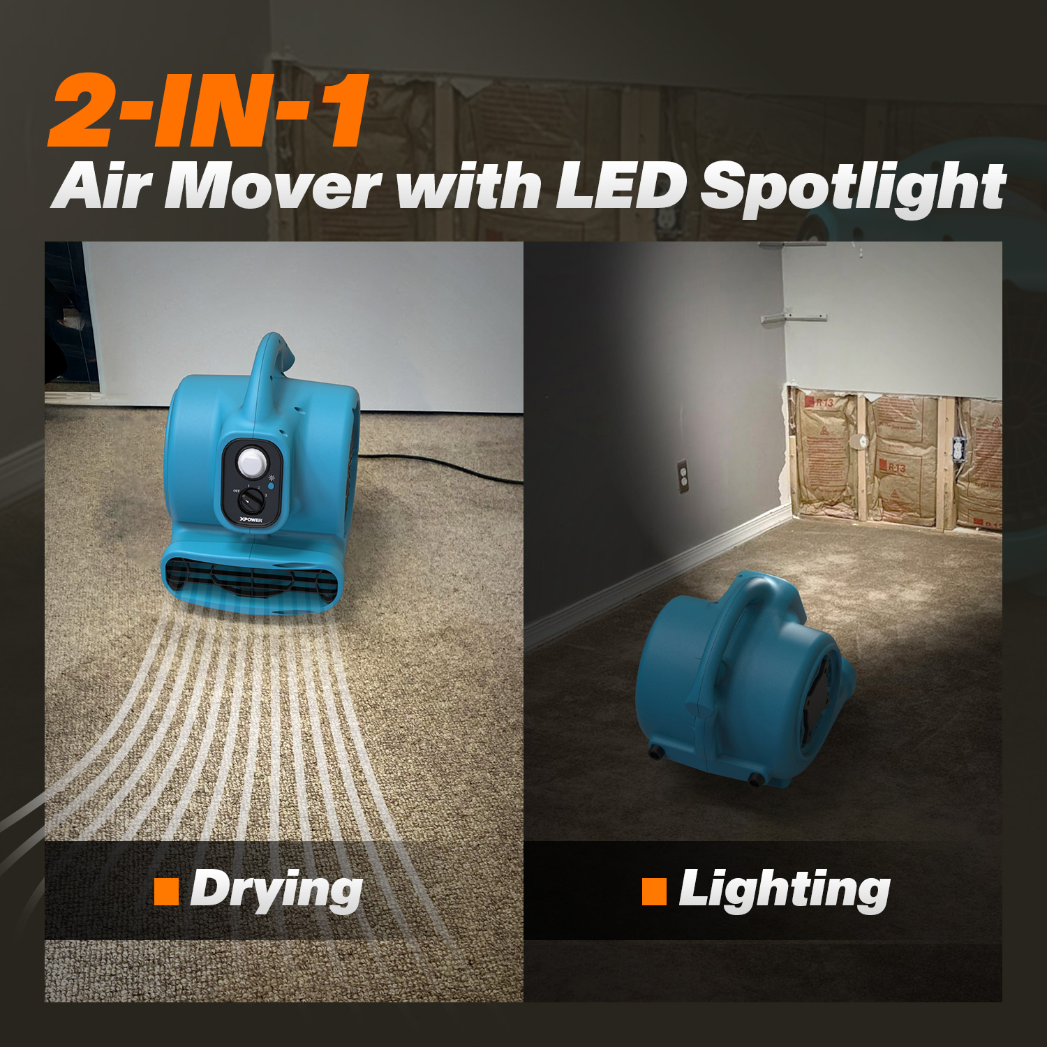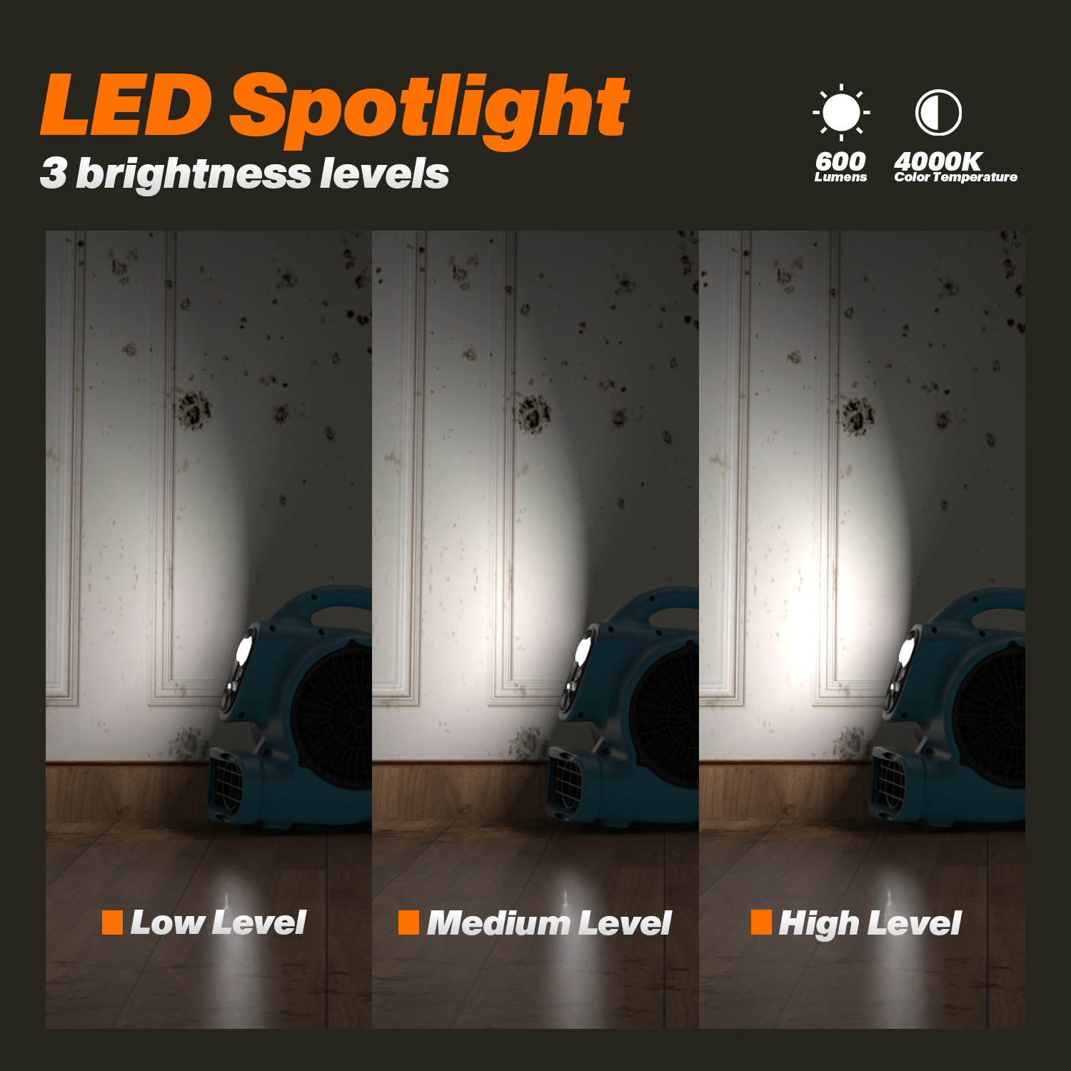 Wat deze luchtverplaatser onderscheidt, is de ingebouwde LED-spot met een lichtopbrengst van 600 lumen en 3 helderheidsstanden. Hierdoor kunt u ook in donkere ruimtes efficiënt werken zonder extra verlichting. Ideaal voor renovaties, garages, opslagruimtes of waterherstelprojecten.