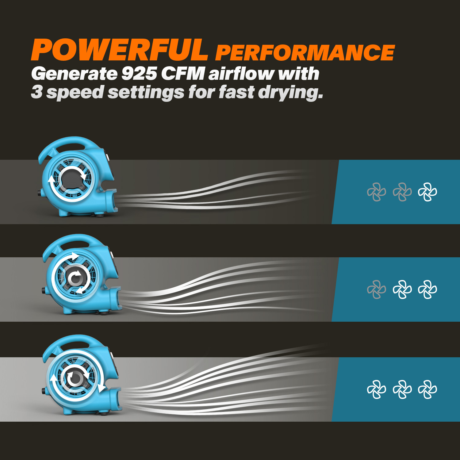 Ondanks zijn compacte afmetingen levert de P-230L indrukwekkende prestaties. De energiezuinige 1/4 HP inductiemotor genereert een luchtstroom tot circa 1570 m³/u (925 CFM) en beschikt over 3 instelbare snelheden. Hierdoor kunt u de luchtstroom eenvoudig afstemmen op elke situatie, van lichte ventilatie tot intensieve droogtoepassingen.