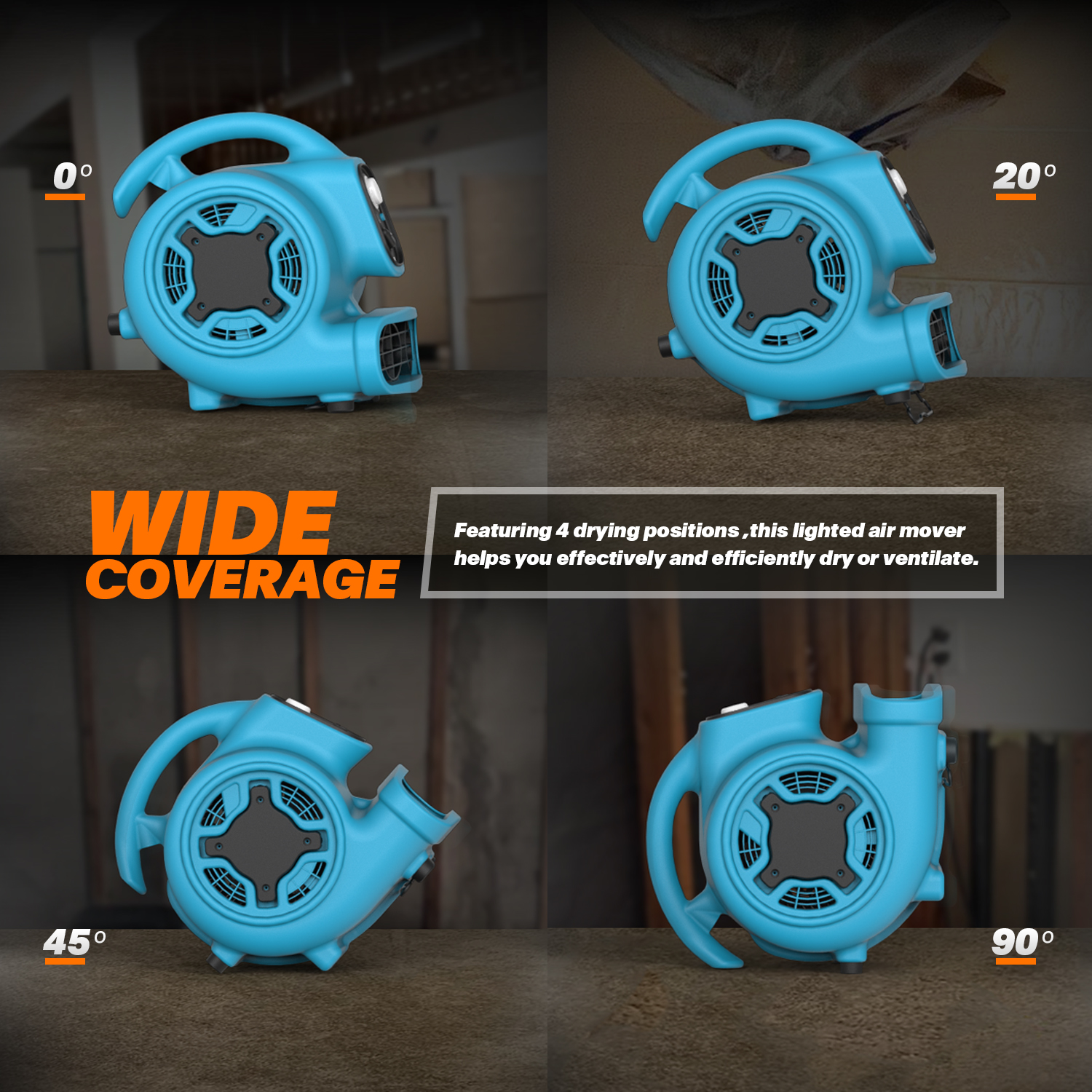De luchtverplaatser kan in 4 verschillende standen (0°, 20°, 45° en 90°) geplaatst worden, waardoor u de luchtstroom precies kunt richten waar nodig. Dit maakt het apparaat uitermate geschikt voor het drogen van vloeren, muren, plafonds en moeilijk bereikbare ruimtes zoals kruipruimtes, onder kasten of in voertuigen.