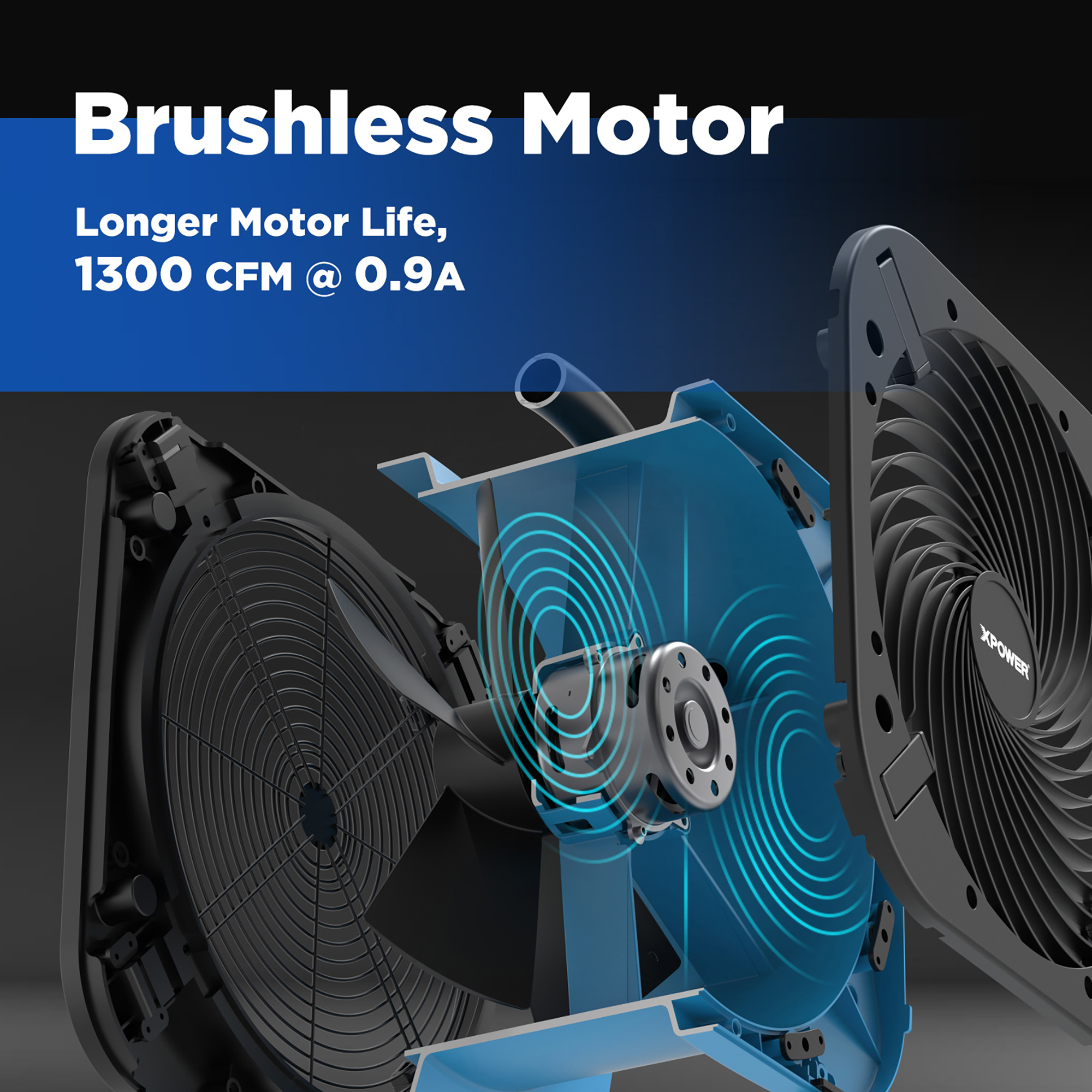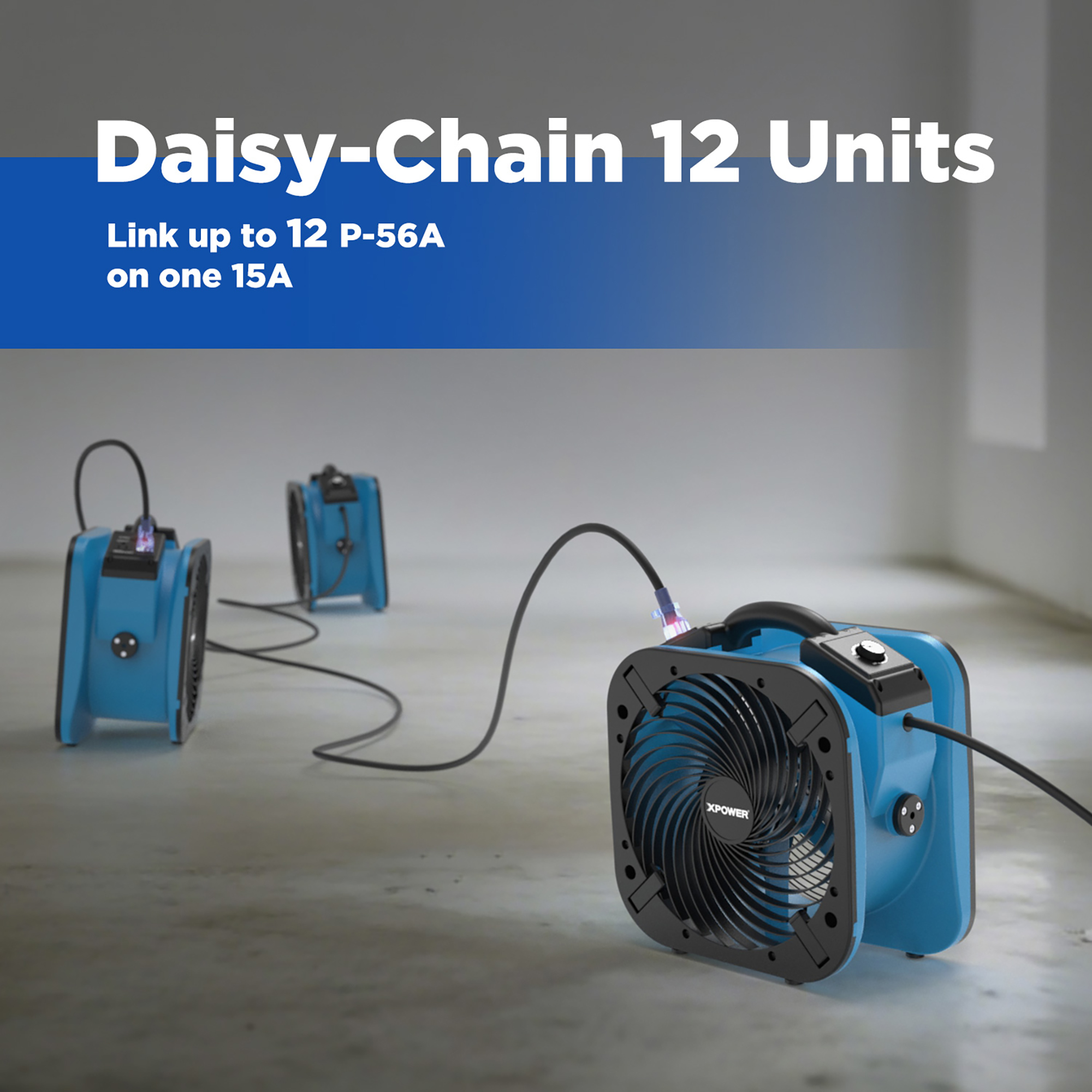 Met een luchtverplaatsing tot 1300 CFM (ca. 2200 m³/u) en een energieverbruik van slechts 60 W (0,9 A) biedt de P-56A een uitstekende balans tussen kracht en efficiëntie. De ingebouwde variabele snelheidsregeling maakt het mogelijk om de luchtstroom nauwkeurig af te stemmen op de toepassing, van lichte ventilatie tot intensief drogen bij waterschade.
