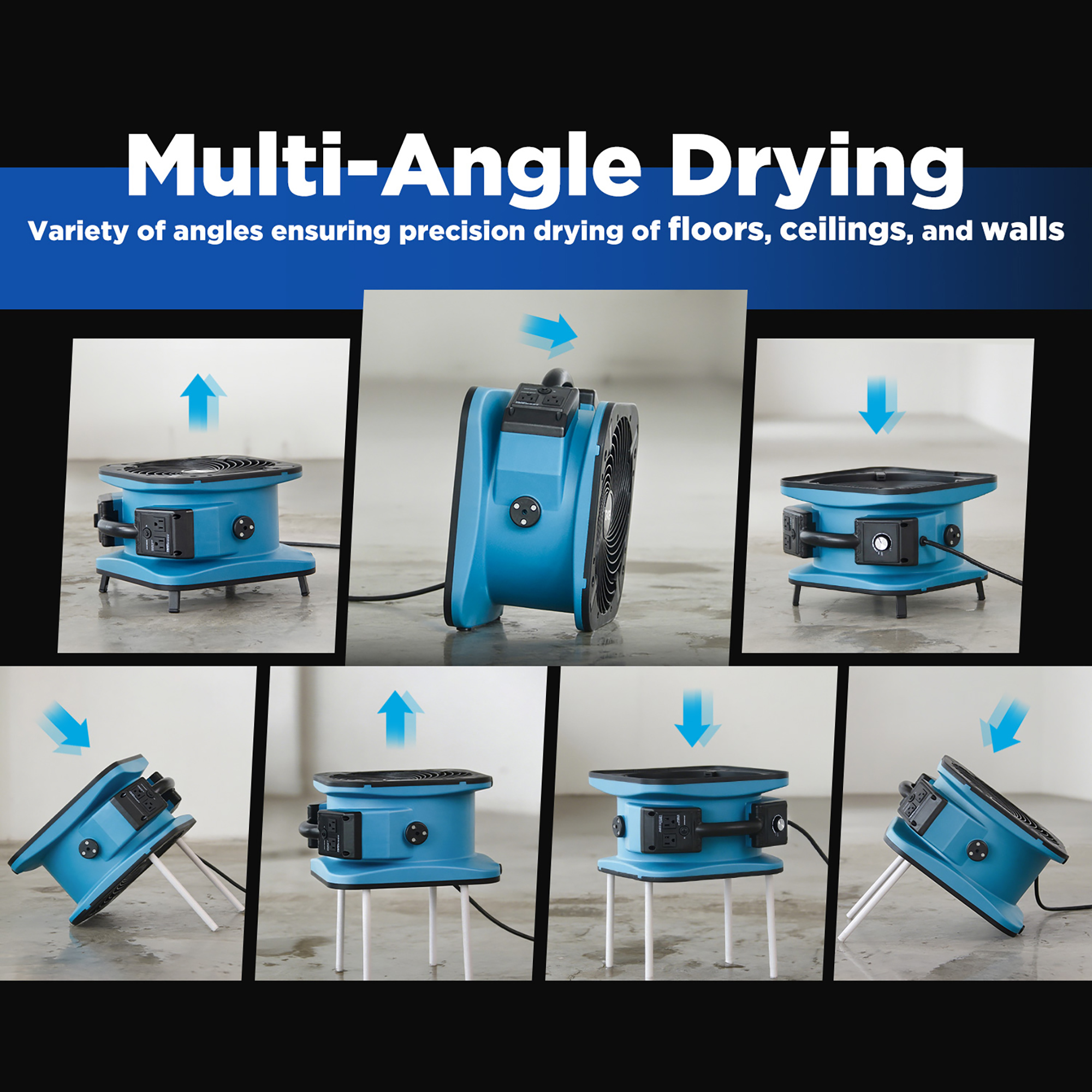 De P-56A is ontworpen voor maximale veelzijdigheid. Dankzij de uitklapbare poten aan de voor- en achterzijde kan het apparaat in verschillende standen worden gebruikt, waaronder downdraft (vloergericht), verticale luchtstroom en schuine posities. Daarnaast is het mogelijk om met optionele PVC-stangen extra posities te creëren, wat vooral handig is bij het drogen van plafonds of moeilijk bereikbare plekken.